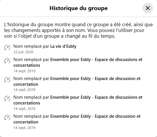Ce compte est subitement devenu administrateur du groupe “La vie d’Esbly”, anciennement “Ensemble pour Esbly”, un groupe créé avant l’élection précédente par l’équipe actuellement au pouvoir lorsqu’elle était encore dans l’opposition. Jusqu’à récemment, l’administration du groupe était assurée par un membre de leur liste non élu ; le changement soudain, au profit d’un profil récent et quasiment inconnu, surprend également.